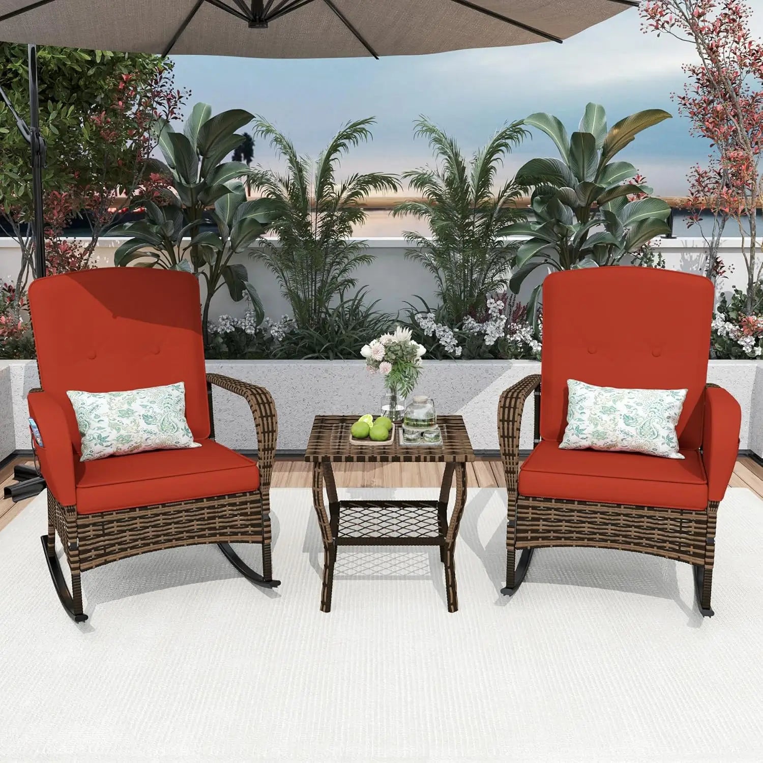 Transform your outdoor space into a stylish oasis with the Stylish 3-Piece Patio Furniture Set with Rocking Chairs. This exquisite set is designed to elevate your patio experience!
