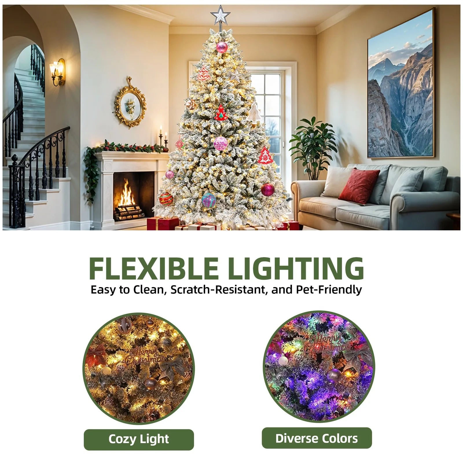 - 1,000 adjustable branch tips and a snow-drift finish give you a lush canvas, ideal for garlands, ribbons, and your favorite ornaments.