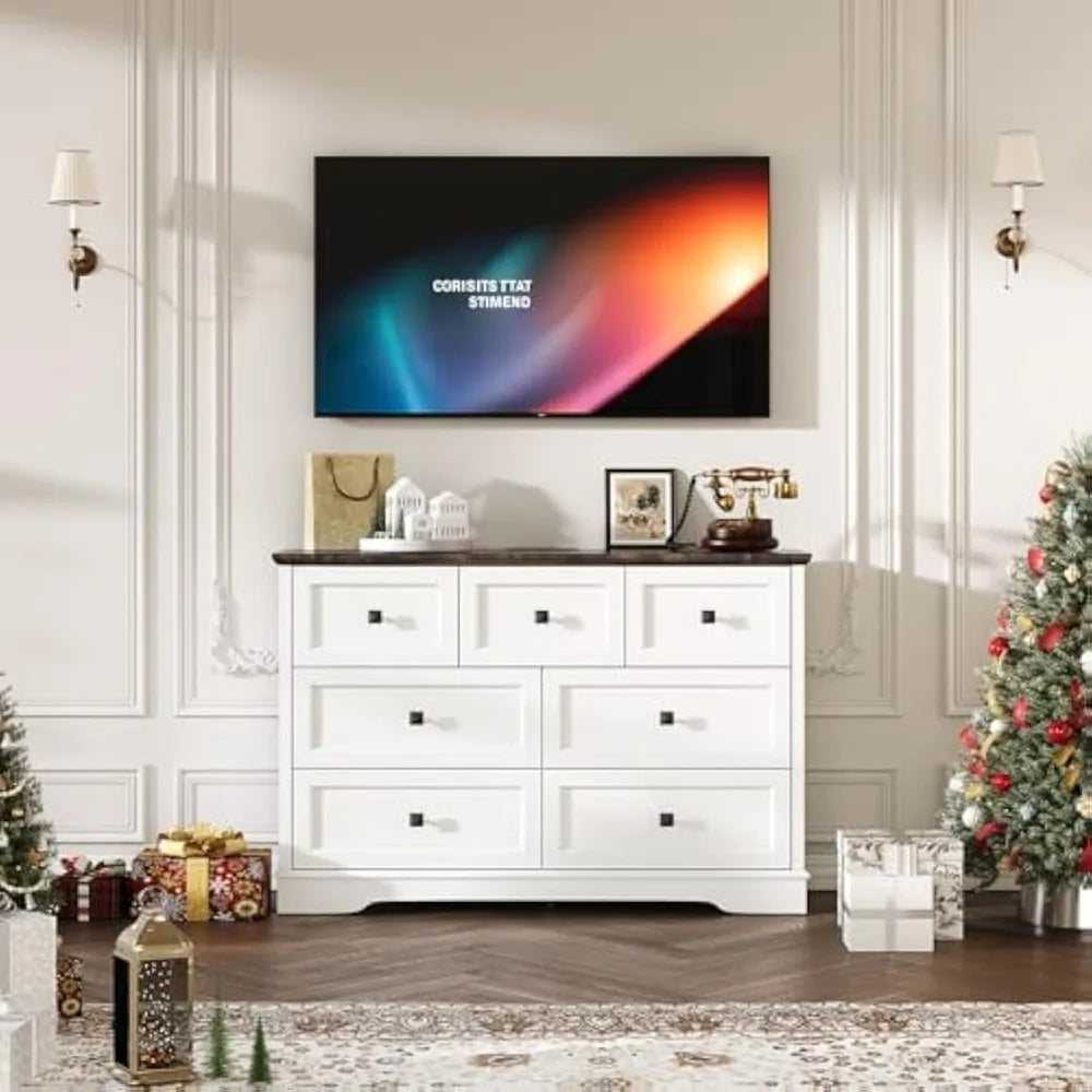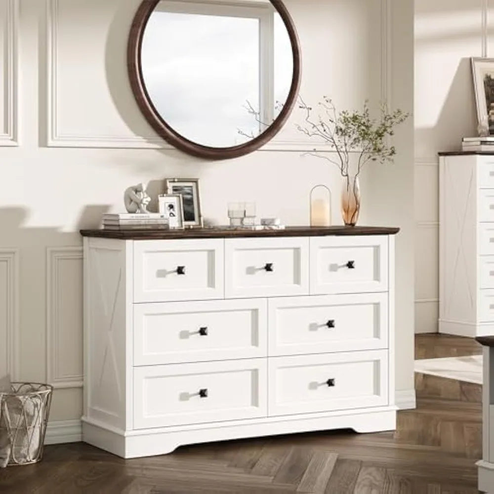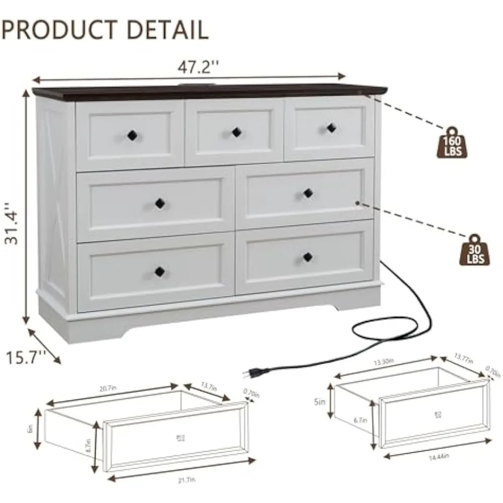Experience the DAFIFY Farmhouse 7 Drawer Dresser With Charging Station in White, backed by My Store's trusted reputation for quality and style, designed to fit both classic and modern bedrooms.