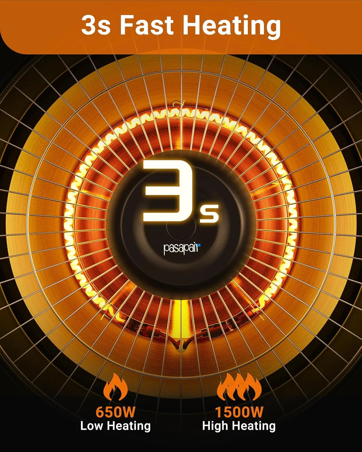 - Two heat levels (650W and 1500W) deliver fast, targeted warmth in seconds, keeping you comfortable on chilly evenings outdoors, with efficient energy use.