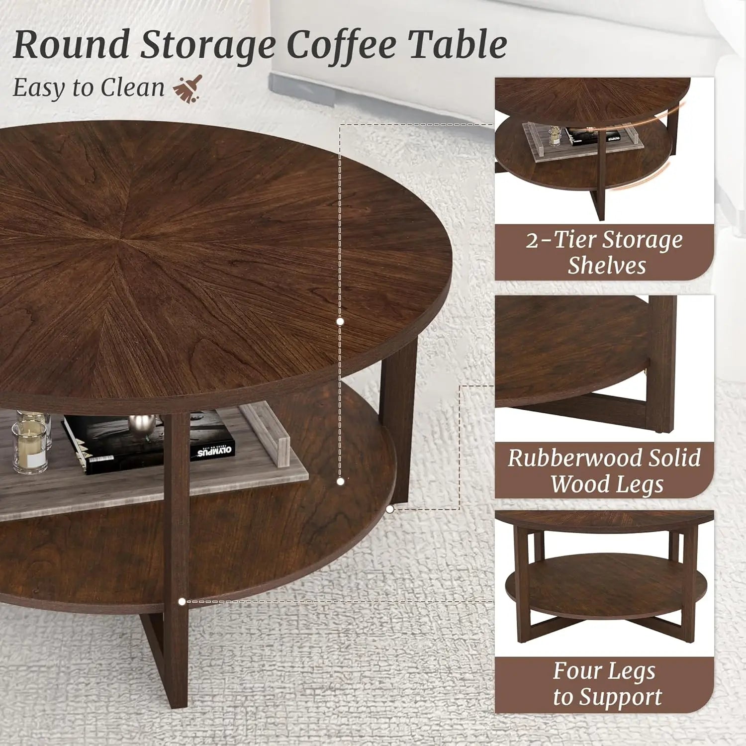 Rustic Modern Round Coffee Table with 2-Tier Storage